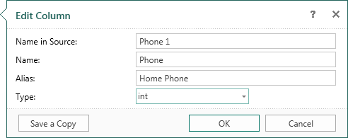 Колонку данных можно отредактировать. Для этого, следует выбрать пункт Редактировать (Edit) в контекстном меню выделенной колонки или нажать кнопку Редактировать (Edit) на панели инструментов в словаре данных. После этого, пользователю будет отображено окно Редактирование колонки (Edit Column), в котором можно изменить такие параметры как Наименование в источнике (Name in Source), Наименование (Name), Псевдоним (Alias) и Тип (Type) редактируемой колонки. Изменения будут приняты после нажатия кнопки Ok. На рисунке снизу представлено окно Редактирование колонки (Edit Column):