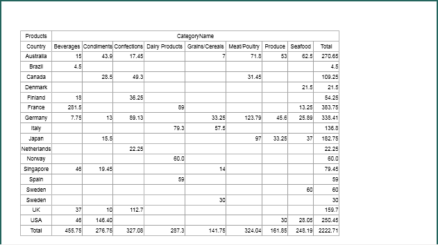 В генераторе отчетов есть возможность создать источник данных на основе кросс-таблицы, т.е. можно создать новый источник, колонками которого будут являться колонки построенной кросс-таблицы, а строками - строки построенной кросс-таблицы. Рассмотрим на примере, создание источника данных на основе кросс-таблицы. На рисунке снизу представлена страница отчета с построенной кросс-таблицей: