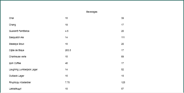 В генераторе отчетов можно создать источник данных на основе уже существующих (добавленных ранее в отчет) источников данных. Источник данных Данные на основе других источников (Data from other DataSource) предоставляет аналогические возможности, что и Запрос к базе данных. При создании такого источника данных можно с помощью визуального интерфейса, в процессе создания источника данных, произвести сортировку, группировку, фильтрацию и вычисление итогов с помощью агрегатных функций. Рассмотрим пример создания данных на основе других источников. Допустим, есть Master-Detail отчет, в котором каждой категории соответствуют некоторое количество продуктов (Подробнее про Master-Detail отчет можно прочитать в справочной системе: Дополнительные функции отчета.). На рисунке снизу представлена страница Master-Detail отчета (представлена частично):