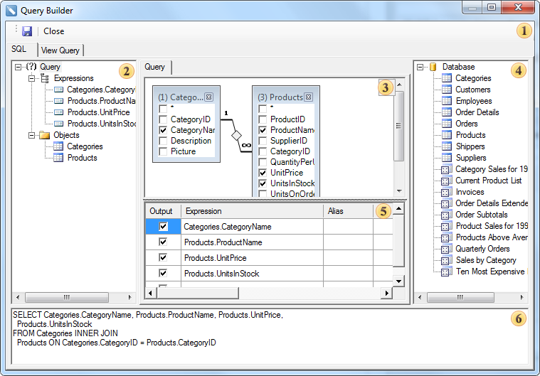 Панель управления конструктором запросов. Представлена кнопками Сохранить (Save), сохраняет запрос, и Закрыть (Close), закрывает конструктор запросов;