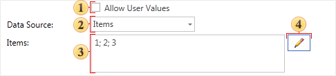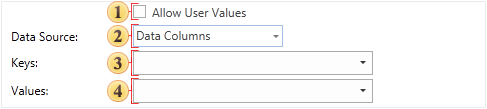 Поле Источник данных (Data Source) содержит выпадающий список значений. В зависимости от выбранного значения: Элементы (Items) или Колонки данных (Data Columns), на данной панели будут располагаться поле Элементы (Items) или поля Ключи (Keys) и Значения (Values).