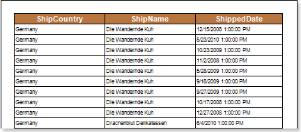 Если необходимо отобразить информацию о заказах, которые совершались в 2008-2013 годах, то используем созданную переменную в отчете. Для этого, добавим фильтр на бэнд Данные (DataBand) с выражением Orders.ShippedDate > Variable1.FromDate && Orders.ShippedDate < Variable1.ToDate. При построении отчета, отобразится только та информации о заказах, которые были осуществлены в 2008-2013 годах. На рисунке снизу представлен отчет с заказами в 2008-2013 годах:
