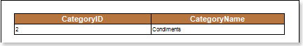 Допустим, добавим фильтр на бэнд Данные (DataBand), где в качестве условия фильтрации, укажем выражение Categories.CategoryID == UNN. Теперь при построении отчета, генератор отчетов учтет условия фильтрации, и отобразит только те записи, у которых значения в колонке CategoryID будут равны значениям хранимым в переменной. В данном случае, запись Condiments. На рисунке снизу представлен пример отчета с использованием переменной в фильтрации данных: