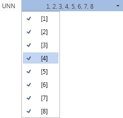 Этот режим работы переменной будет применяться, если параметр Запросить у пользователя (Request from User) включен, а параметр Разрешить пользовательские значения (Allow Users Values) выключен. При использовании данной переменной в отчете, от пользователя могут потребоваться действия по выбору значений из списка переменной. Создадим переменную с именем UNN, в которой будет храниться список элементов от 1 до 8. Используем эту переменную в отчете. На рисунке снизу представлен пример построенного отчета: