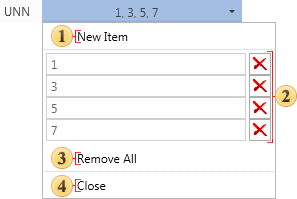 Допустим, добавим фильтр на бэнд Данные (DataBand), где в качестве условия фильтрации, укажем выражение UNN.Contains(Categories.CategoryID). Теперь при построении отчета, в окне вьювера необходимо отредактировать список значений переменной (удалить ненужные элементы, или изменить ключ в поле элемента, или создать новый элемент). На рисунке снизу представлен отредактированный список значений переменной: