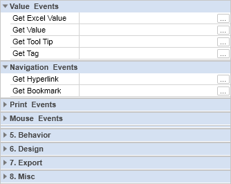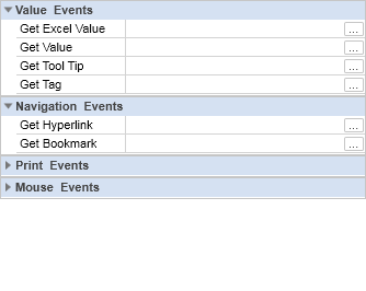 Таблица Свойств (Properties Tab) или Событий (Events) представляет собой таблицу с двумя колонками. В первой колонке отображается название свойства или события, во второй колонке вводятся или выбираются значения этого свойства или события. Количество строк зависит от количества свойств или событий, т.к. одно свойство или событие занимает одну строку. На рисунке снизу представлены таблица свойств (рисунок слева) и таблица событий (рисунок справа):